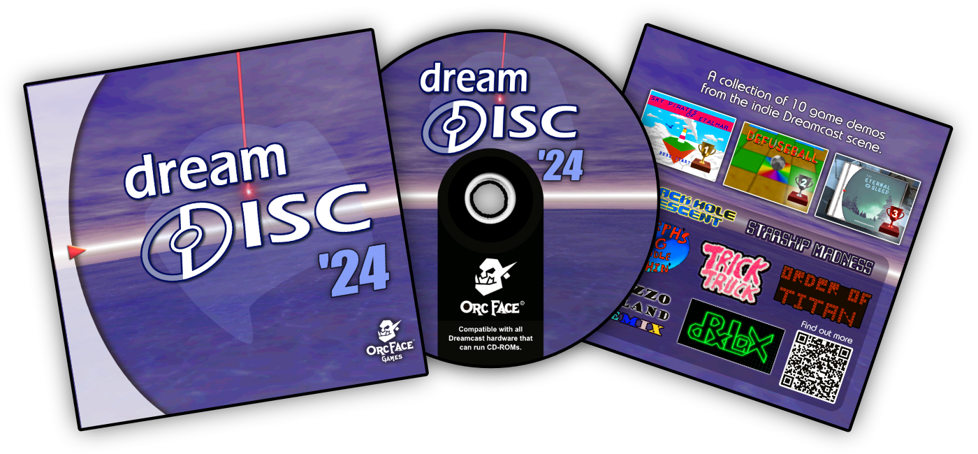 In 2024, the Dreamcast community developed a series of brand new game demos for the Dream Disc '24 game jam in collaboration with Orc Face Games and PsyOp Studios. This free disc contains the top 10 games from that competition as decided by a panel of judges.